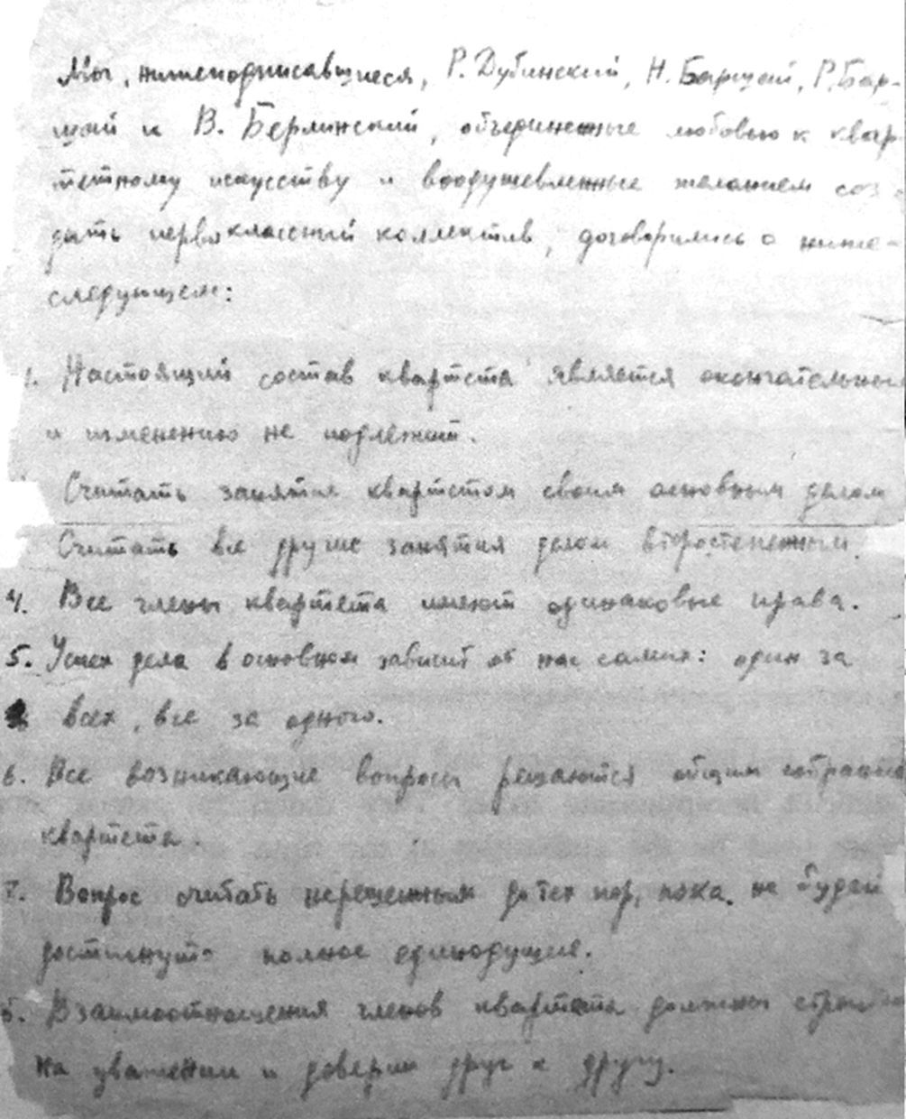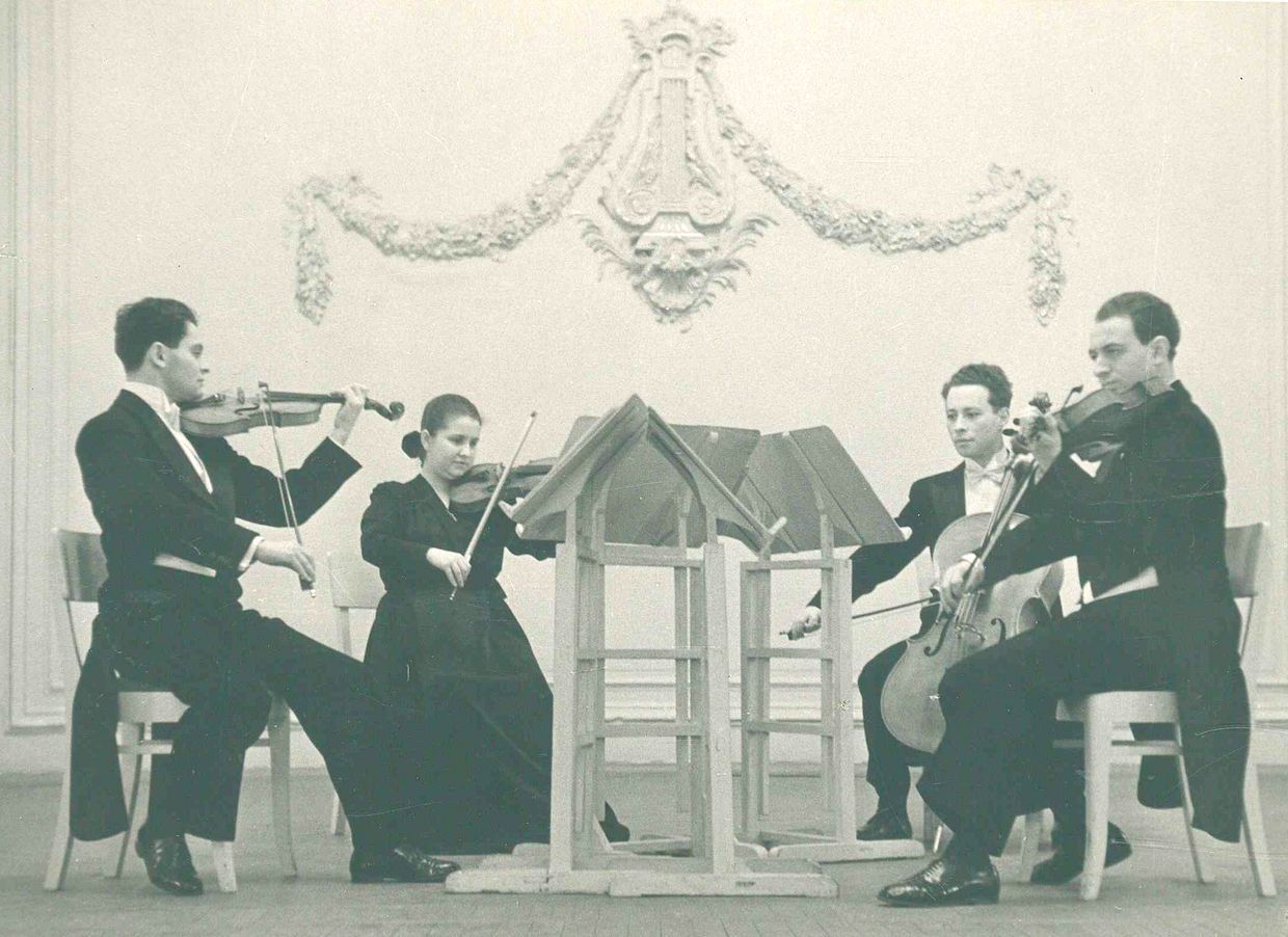 Уже в 1946-м студенческий коллектив был зачислен в штат Московской филармонии. А в 1947 году, сидя в буфете-подвальчике рядом с Московской консерваторией, участники ансамбля – Ростислав Дубинский, Нина Баршай, Рудольф Баршай и Валентин Берлинский подписали кровью клятву верности Квартету.