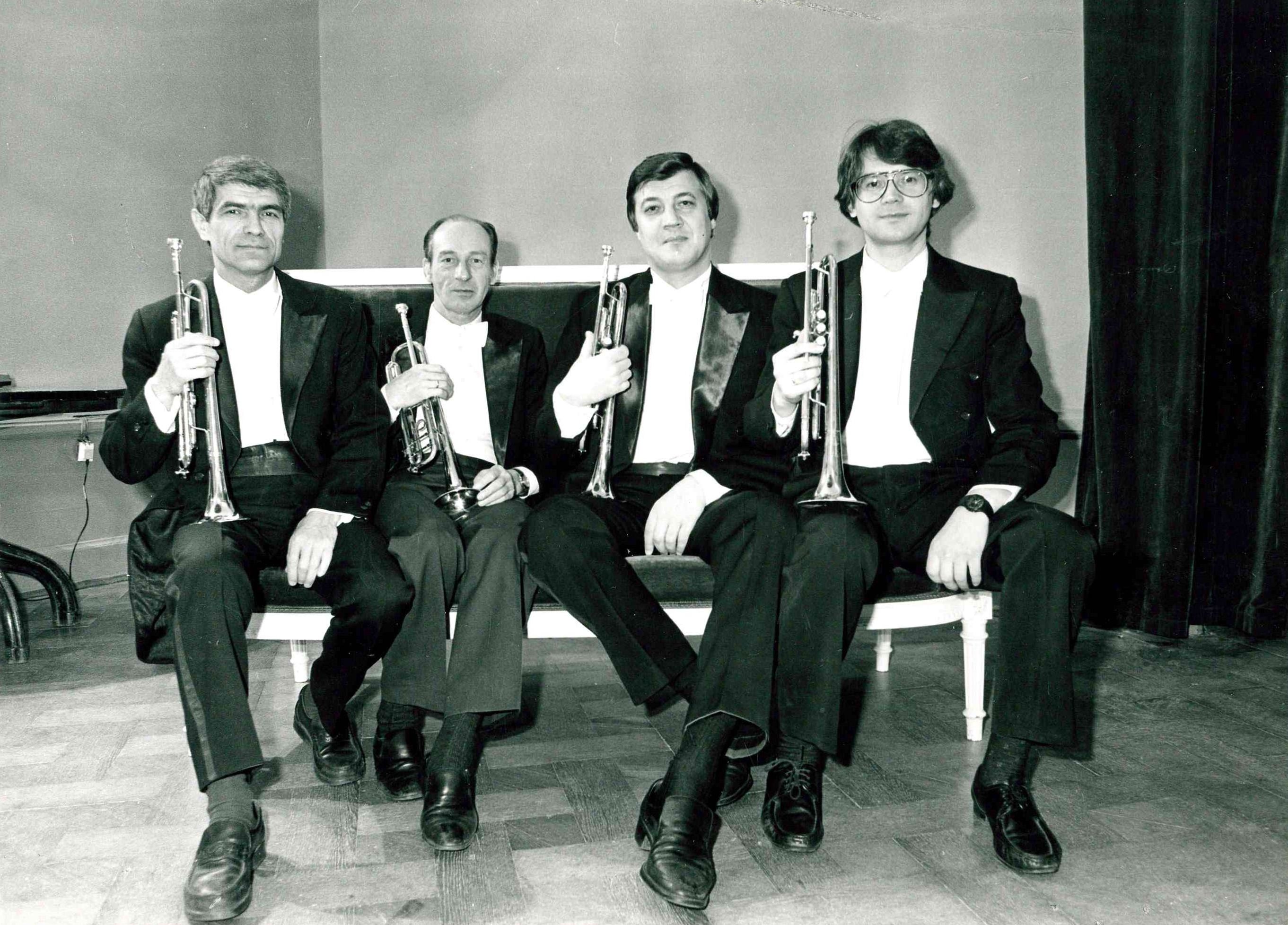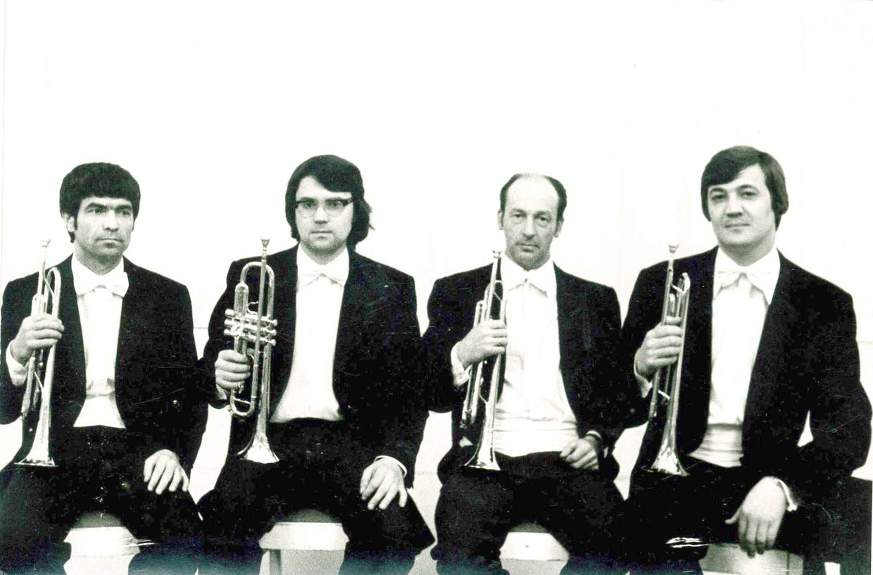 Группа трубачей Оркестра ЗКР (слева направо): Анатолий Степанов, Михаил Романов, Валерий Чирсков, Владимир Кафельников. Год не указан.